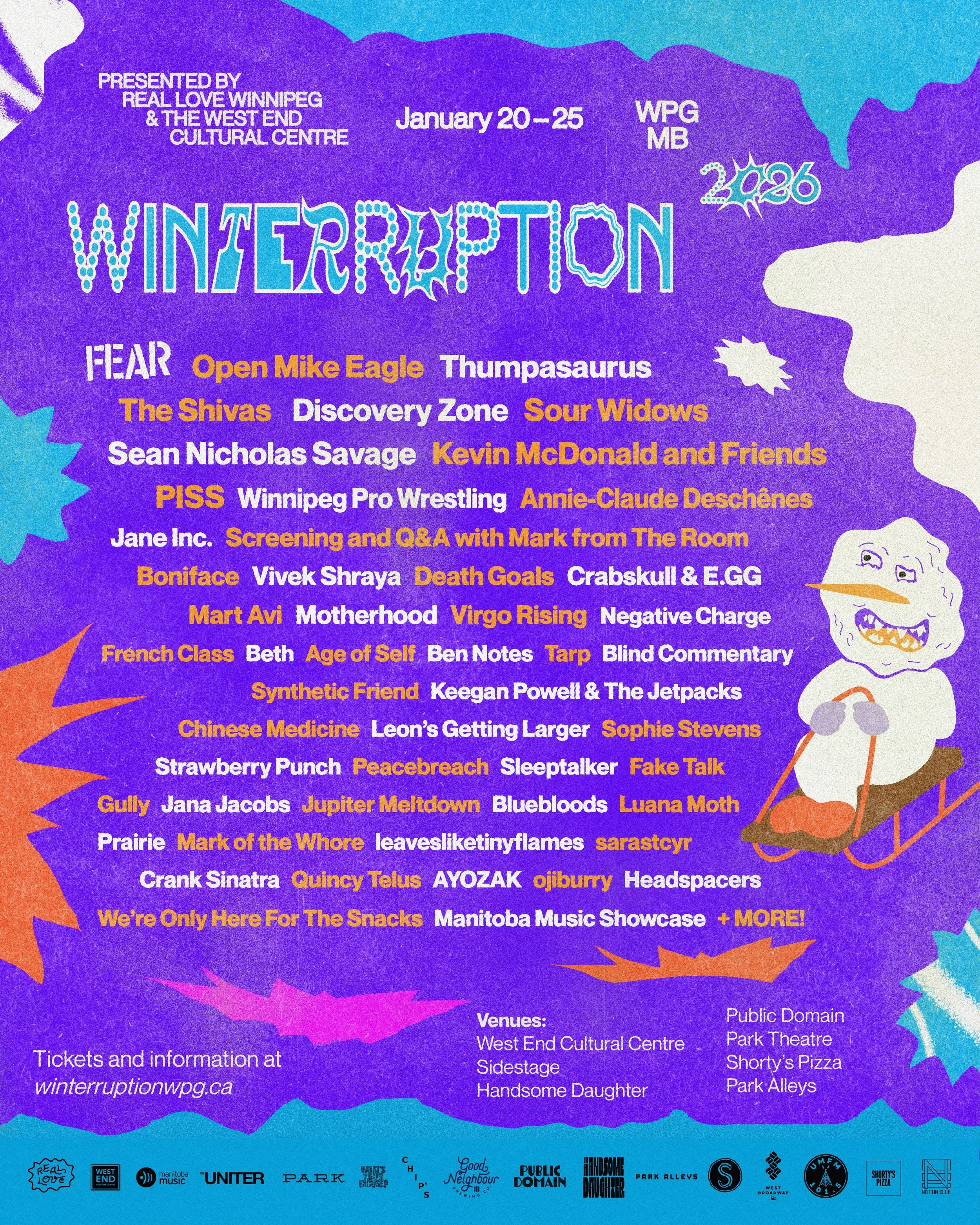 Winnipeg’s Winterruption Festival is back! Presented by Real Love Winnipeg and the West End Cultural Centre, the multidisciplinary festival takes place across various venues around the city, including The Park Theatre, West End Cultural Centre, Handsome Daughter, Public Domain, Sidestage, Park Alleys, and Shorty’s Pizza.